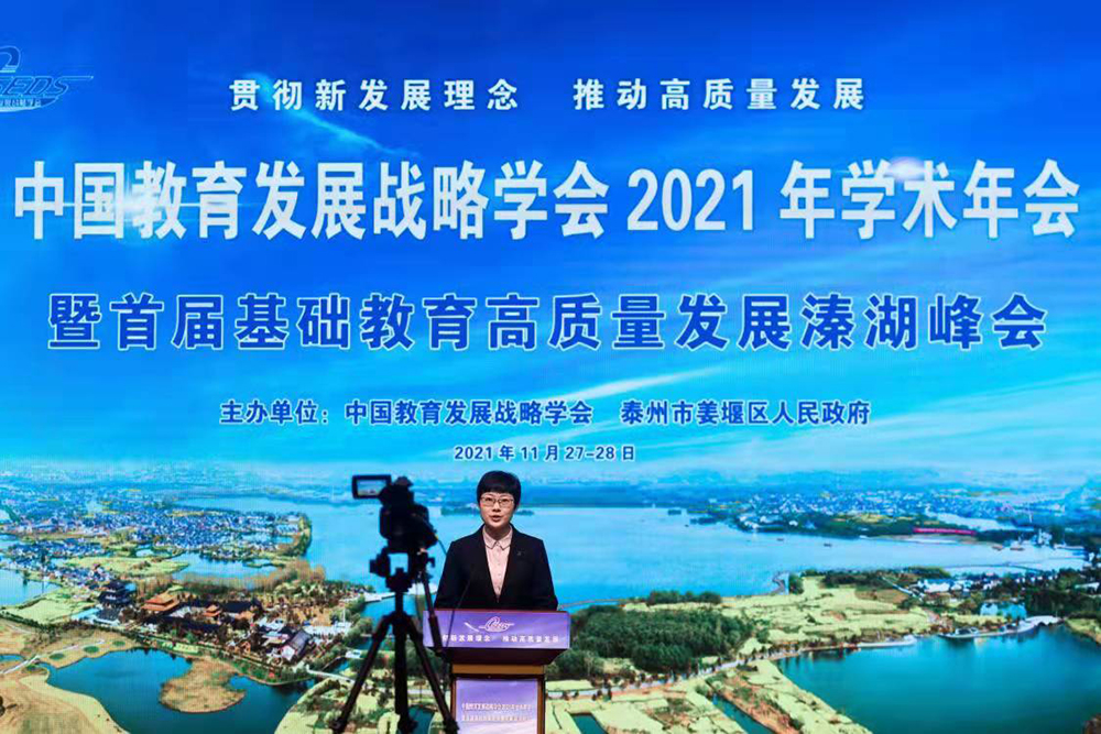 江苏省教育厅副厅长顾月华认为,在实现第二个百年奋斗目标,全面建设社会主义现代化国家的新征程中,教育的先导性、基础性、全局性地位和作用更加凸显,肩负的使命更为重大,围绕总书记对江苏提出的“争当表率、争做示范、走在前列”的要求,她从推进德智体美劳全面培养体系现代化、推进基本公共教育服务体系现代化、推进课程教学与评价体系现代化、推进四有好教师培养培训体系现代化、推进基础教育治理体系和治理能力现代化五个方面介绍了加快推进江苏基础教育领域五个现代化的设想。她表示,江苏将以双减政策在本省的平稳高效落地为前提,坚持教育公益性原则,深化教育改革,促进教育公平,加快建设面向人人学有优教的公共服务制度体系。同时,充分发挥省委教育工作领导小组统筹协调作用,推进各地党委政府履行基础教育管理责任,下大力气推动各级党委政府全体教育局长校长们牢固树立正确政绩观,全面质量观,科学评价观,完善以发展素质教育为导向,基于课程标准的学校质量评价和学生综合素质评价等办法,更加注重发展性、激励性、引导性评价。教育部教育发展研究中心副主任陈如平分析了实现新时期新征程,共同富裕的时代发展任务对教育高质量发展提出的新要求,指出各级各类教育,特别是基础教育在十四五时期应重点关注的发展目标。泰州市人民政府副市长徐文进指出,泰州始终保持教育优先发展定力,以全面实现教育现代化为目标,以办好人民满意的教育为宗旨,深入推进教育转型发展。今年初,市委、市政府把新春第一会定为“办好人民满意的教育推进大会”,坚持以最好的资源支持教育、以最强的改革支持教育、以最大的关爱支持教育,充分体现推进教育优先优质发展,办好人民满意教育的坚定决心。姜堰区委副书记、区长孙靓靓认为,姜堰在推进经济高质量发展的同时,始终把教育作为改善民生的基本工程,优先发展教育事业,加快建设人民满意的教育现代化强区。姜堰精心打造“高位均衡、优质精品、人本和谐”的教育体系,并在江苏省率先提出“教育立区”战略,致力办“品质、品牌”教育,创“教育之乡”特色,力争“十四五”期间实现教育现代化、特色化和国际化,建成群众满意、全国有名、省内一流的教育高地。