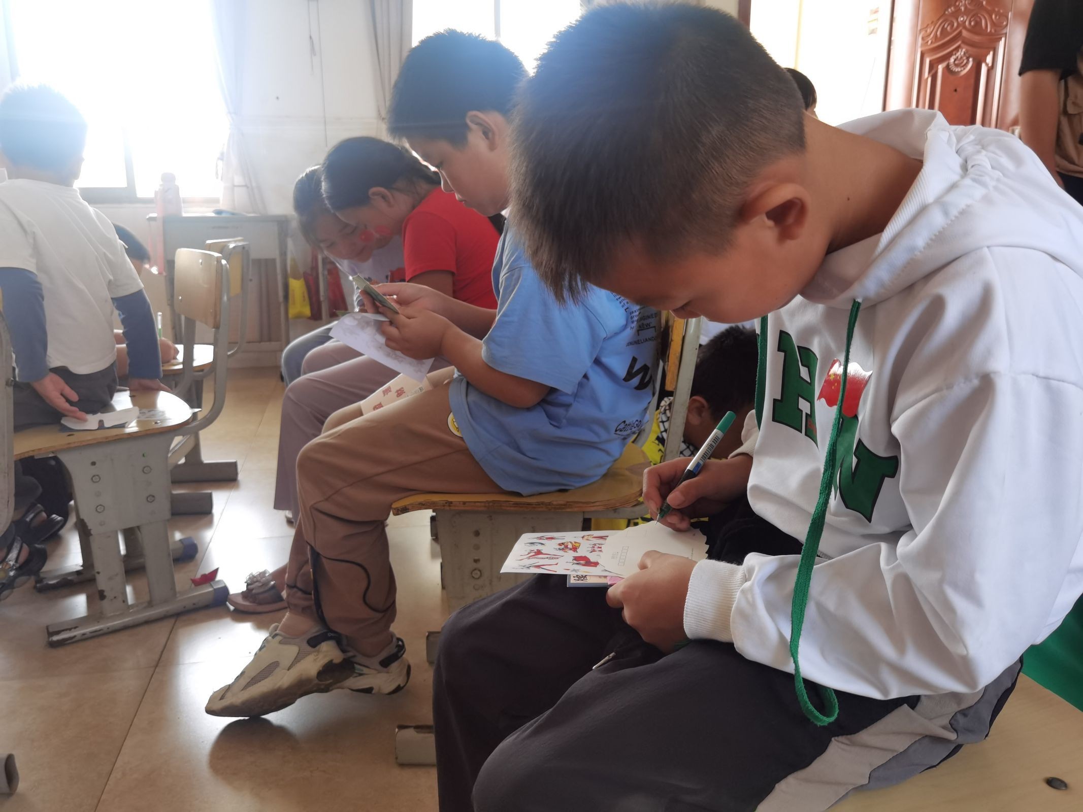 图为孩子们在卡片上写上自己的小小梦想和对祖国的祝愿
