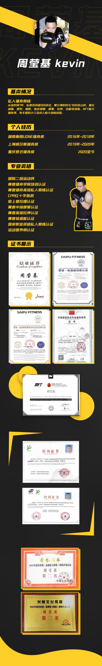 2016年从事健身行业至今,为300余名会员成功蜕变,在此过程中,我发现MFT格斗健身瘦身塑型效果更佳。2019年我完成了MFT格斗健身深造,通过专业系统的学习,再加上多年的训练经验相结合,有了自己的授课方式和风格,能够更精准的为学员提供专业的指导和训练,让更多的学员坚持并爱上健身,让健身成为一种习惯!