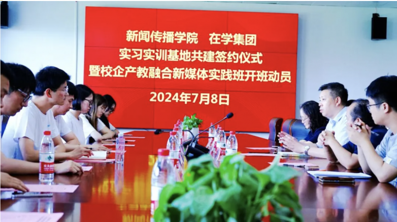 在产教融合校企合作签约仪式上,新闻传播学院党委书记陈长伟发表致辞,强调了此次合作对于提升学生实战能力、促进产学研深度融合的重要意义。新闻传播学院院长罗荣华表达学院对于此次实战班高度重视,希望可以打造校企合作长期开展实训班。在学集团CEO陈大千则分享了企业对于新媒体人才的需求与期待,表示在学集团将全力支持实战班的教学活动,为学生提供最前沿的行业知识和实践机会。
