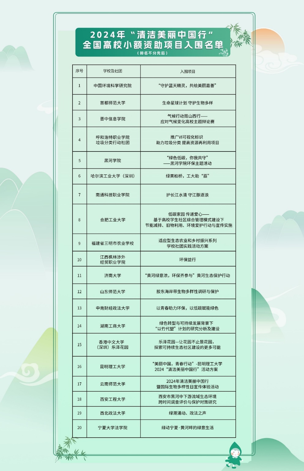 经过主办方及相关领域专家的认真评审,2024年“清洁美丽中国行”入围方案最终确定。入围项目主题鲜明、形式丰富、构思新颖,既有展示地域环保特色的宣传实践,也有结合创新技术的实施项目,如宁夏大学“绿潮涌动・宁夏川”社团围绕黄河流域生态环境保护,策划了“绿动宁夏・黄河畔的绿意生活”活动,努力提升人们保护黄河流域生态环境意识、形成绿色生活风尚;江西枫林涉外经贸职业学院设计了“环保益行——基于AR技术的环保科普监督社交平台”,通过环保社交平台的打造,以VR游戏、科普文章等形式趣味性地介绍环保知识,基于云服务搜索及AR识别技术提高垃圾分类便捷性,促进人们共同参与环境保护等等。