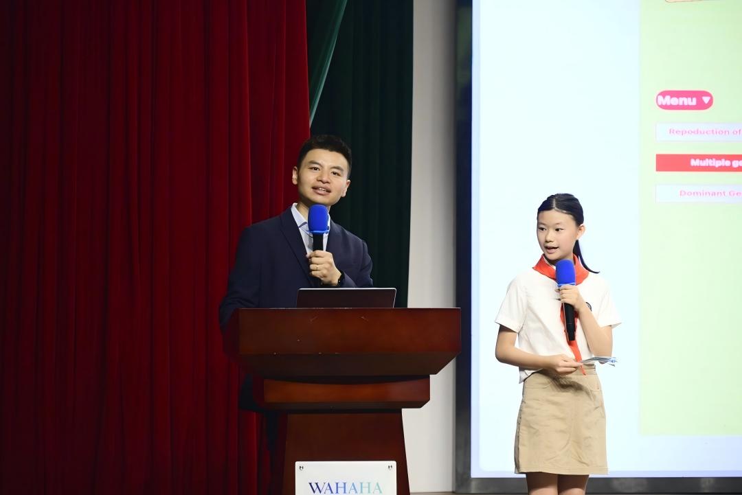 9月2日,杭州娃哈哈双语学校小学部和初中部的开学典礼上,学校iLab负责人叶磊波老师与六年级学生何若晴联手呈现了一堂充满未来感与科技魅力的开学第一课。从令人惊艳的编程作品到引人入胜的基因配对小游戏,每一个环节都牢牢吸引了孩子们的注意力,充满了新奇与乐趣。