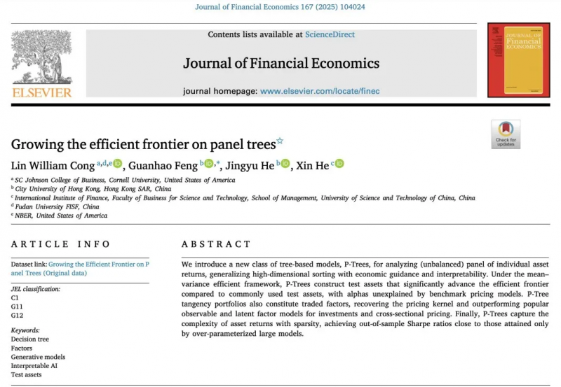这项题为《在面板树上扩展有效边界》(Growing the Efficient Frontier on Panel Trees)的研究成果,发表于具有极高的学术影响力的金融学界顶尖期刊《金融经济学杂志》(Journal of Financial Economics),获得了金融投资界的广泛关注。该成果研究团队由港城大商学院冯冠豪教授与何靖宇教授共同领导,利用人工智能(AI)技术,提升投资组合构建的预测精准度与可解释性。该研究不仅为金融学中传统的排序和分组方法提供了创新的替代选择,还展示了人工智能技术在金融数据建模中的广泛应用潜力。