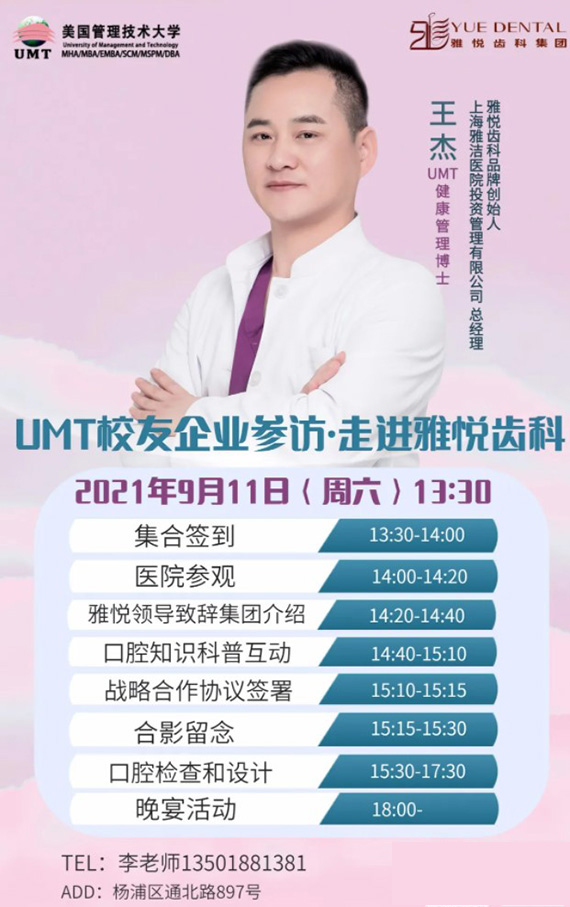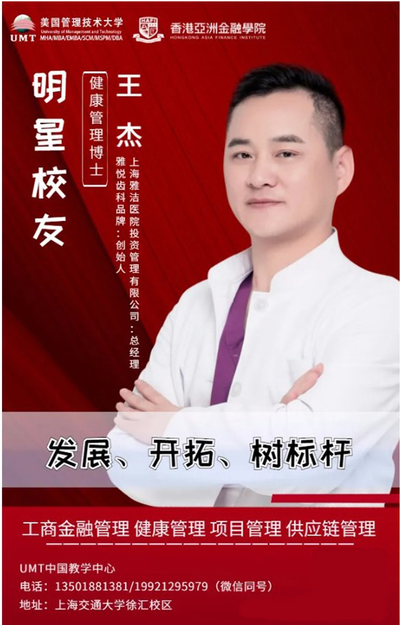 王杰:各位老师、同学大家好!我是UMT健康管理DBA-2021级学员牙医王杰,从事口腔教学、科研和临床工作二十余年,多年来长期关注和研究国家卫生政策,在齿科连锁机构投资、运营管理、医院建设发展规划、医患心理学等方面有所建树,目前是雅悦齿科YUE DENTAL品牌创始人、上海雅洁医院投资管理有限公司总经理。