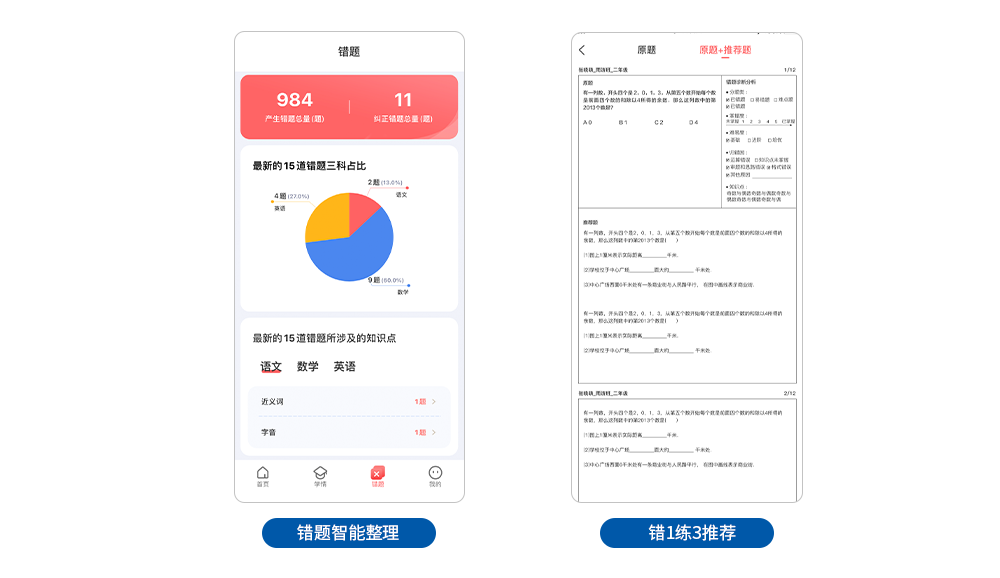 一是通过拍照采集学生作业,由系统记录学习轨迹并形成反馈报告,每天发送至家长,强化家校沟通、提高服务满意度;二是借助大数据分析得出的阶段学情报告,即周报、单元报与学期报,找准学生短板,辅助老师“对症下药”、提高辅导效率;三是运用系统为学生定制的智能错题集与强化练习,开展针对性查漏补缺,提升学员学习效率与质量。