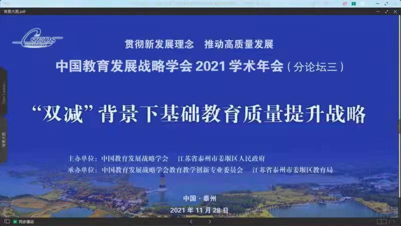 江苏省教育厅副厅长顾月华认为,在实现第二个百年奋斗目标,全面建设社会主义现代化国家的新征程中,教育的先导性、基础性、全局性地位和作用更加凸显,肩负的使命更为重大,围绕总书记对江苏提出的“争当表率、争做示范、走在前列”的要求,她从推进德智体美劳全面培养体系现代化、推进基本公共教育服务体系现代化、推进课程教学与评价体系现代化、推进四有好教师培养培训体系现代化、推进基础教育治理体系和治理能力现代化五个方面介绍了加快推进江苏基础教育领域五个现代化的设想。她表示,江苏将以双减政策在本省的平稳高效落地为前提,坚持教育公益性原则,深化教育改革,促进教育公平,加快建设面向人人学有优教的公共服务制度体系。同时,充分发挥省委教育工作领导小组统筹协调作用,推进各地党委政府履行基础教育管理责任,下大力气推动各级党委政府全体教育局长校长们牢固树立正确政绩观,全面质量观,科学评价观,完善以发展素质教育为导向,基于课程标准的学校质量评价和学生综合素质评价等办法,更加注重发展性、激励性、引导性评价。教育部教育发展研究中心副主任陈如平分析了实现新时期新征程,共同富裕的时代发展任务对教育高质量发展提出的新要求,指出各级各类教育,特别是基础教育在十四五时期应重点关注的发展目标。泰州市人民政府副市长徐文进指出,泰州始终保持教育优先发展定力,以全面实现教育现代化为目标,以办好人民满意的教育为宗旨,深入推进教育转型发展。今年初,市委、市政府把新春第一会定为“办好人民满意的教育推进大会”,坚持以最好的资源支持教育、以最强的改革支持教育、以最大的关爱支持教育,充分体现推进教育优先优质发展,办好人民满意教育的坚定决心。姜堰区委副书记、区长孙靓靓认为,姜堰在推进经济高质量发展的同时,始终把教育作为改善民生的基本工程,优先发展教育事业,加快建设人民满意的教育现代化强区。姜堰精心打造“高位均衡、优质精品、人本和谐”的教育体系,并在江苏省率先提出“教育立区”战略,致力办“品质、品牌”教育,创“教育之乡”特色,力争“十四五”期间实现教育现代化、特色化和国际化,建成群众满意、全国有名、省内一流的教育高地。