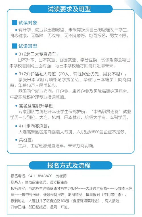 刘文英说,如今,通才学校的特色教学,不仅赢得国内世界500强企业青睐,也赢得中日学校“中高职贯通,学分互换”的殊荣。今年通才学校推出的3+2赴日大专直通车、4+1大专、5+2本科定向委培班都是与市场紧密结合的产物。对于中职生来说,人职匹配,适合的才是好的。中职生前行的道路充满挑战、色彩斑斓。只要坚持不断前行,条条大连通罗马!