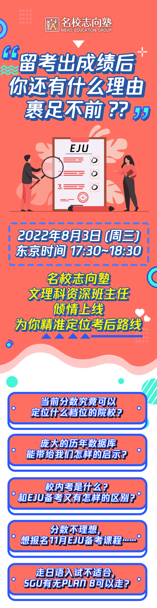 为了尽快为大家做好各项安排,名校志向塾Insights视频号直播间将请到文理科资深班主任和早大前辈帮助各位理清留考后的重要事项及其优先顺位,快速进入备考最佳状态!