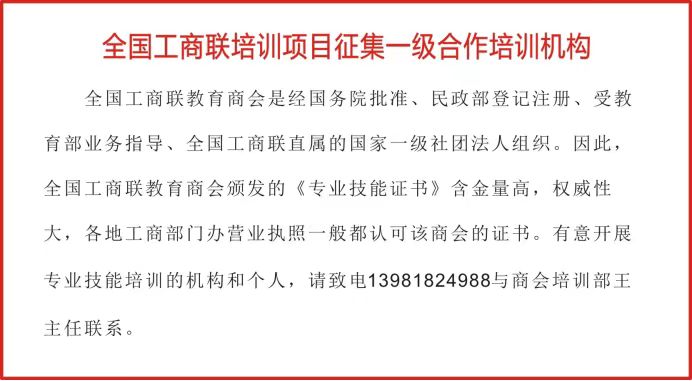 全国工商联教育商会专业技能培训项目,现面向社会征集合作培训机构。全国工商联教育商会是经国务院批准、民政部登记注册、受教育部业务指导、全国工商联直属的国家一级社团法人组织。因此,全国工商联教育商会颁发的《专业技能证书》含金量高,权威性大,各地工商部门办营业执照一般都认可该证书。有意开展专业技能培训或组织相关机构开展专业技能培训工作者。