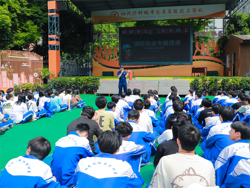 此次演练中,四川兴科城市交通高级技工学校还邀请了郫都区消防救援大队德源中队专业消防救援人员为师生开展消防安全知识讲座。通过防灾安全知识讲解、科学救援现场演示、互动问答等方式,提高全校师生消防安全意识、自救互救基本技能。