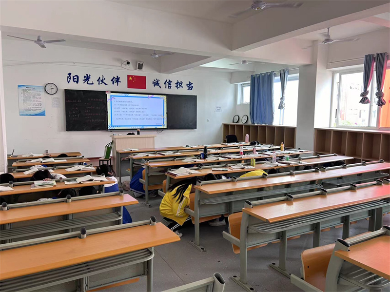 5月9日下午14时30分,随着地震预警铃声响起,学校低楼层的师生立即通过安全通道,紧急疏散;高楼层学生在老师的指导下,迅速抱头于课桌下,就地避险,待主震结束后,各班级老师迅速组织学生有序地撤离到操场安全地带。