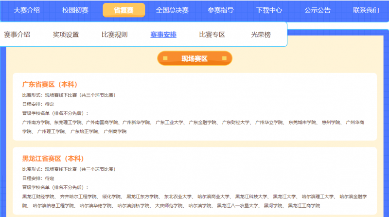省复赛共计分为9个赛区。其中,广东(仅本科组)、山东、黑龙江为现场赛,其余各省将分为6个网络赛区(4个本科组赛区、2个高职组赛区)进行比赛。