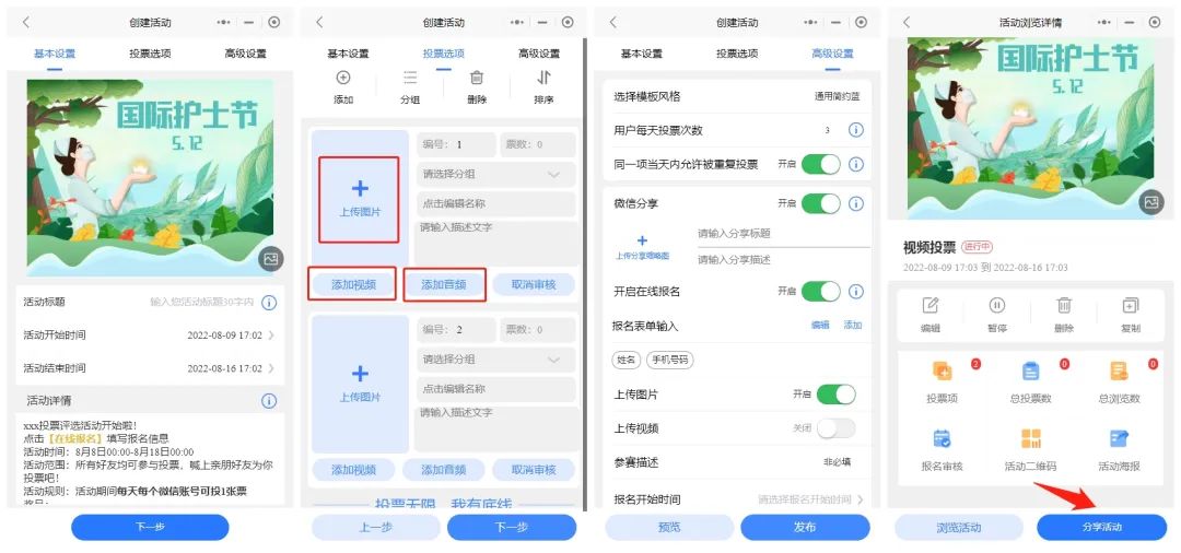 如果需要选择自己报名,可以发起投票征集,后台开启在线报名,让选手报名上传参赛资料。