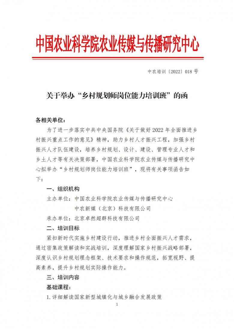 为紧扣新时代实施乡村建设行动,推进乡村全面振兴人才需求,通过密集政策解读和实战培训,深度理解国家乡村振兴战略部署,深度认识乡村规划理念框架、技术要求和操作规范,拓宽视野、提高素养,提升乡村规划实际操作能力。“乡村规划师岗位能力培训班”将由中国农业科学院农业传媒与传播研究中心、中农新媒(北京)科技有限公司主办,北京卓然超群科技有限公司承办授权招生。培训合格人员,由主办颁发农业农村技术人才岗位能力证书。