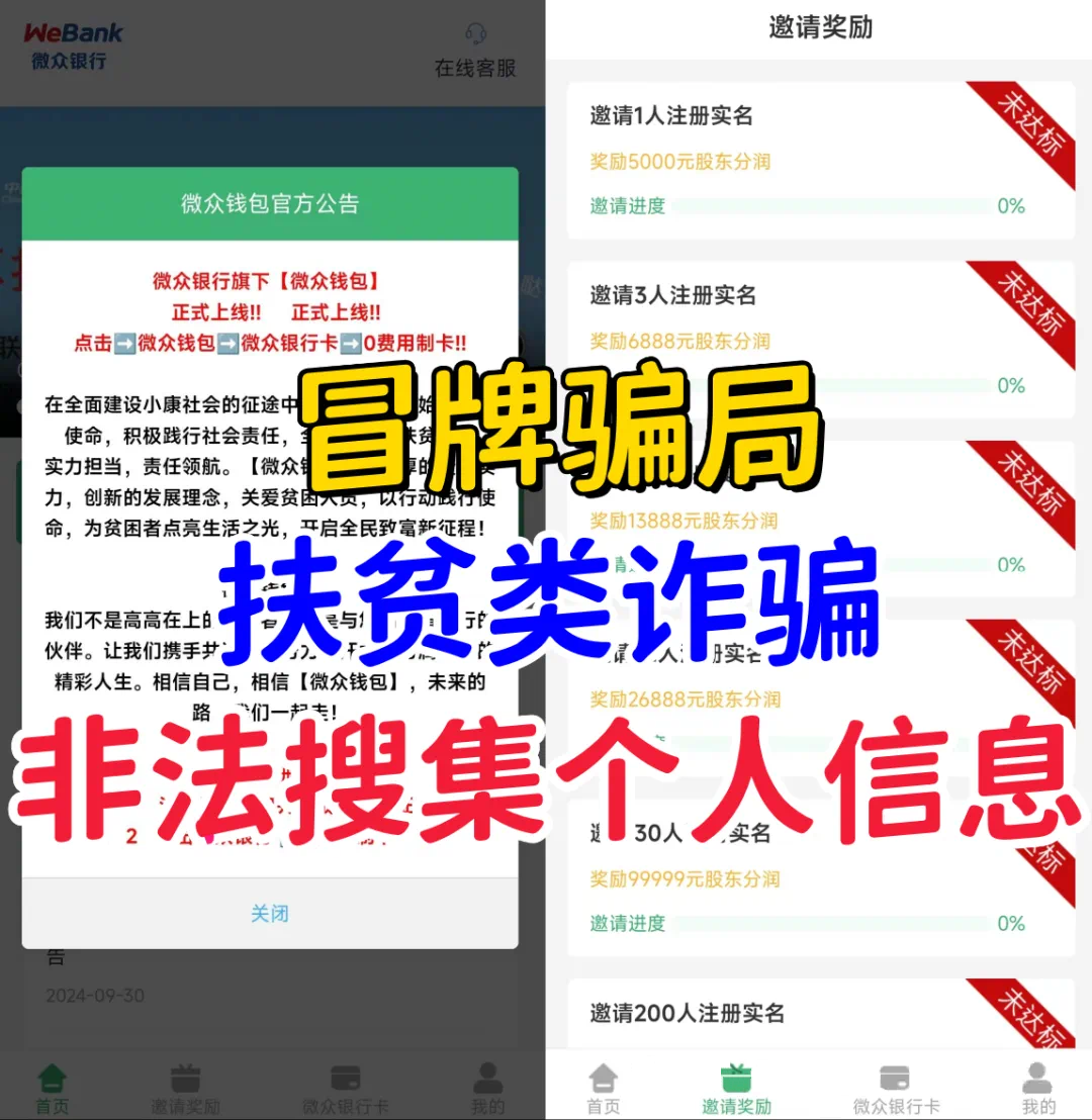 不法分子冒充微众银行的名义,虚构并散布涉诈APP,该项目打着扶贫的名义,宣传免费注册,邀请新人注册送现金的旗号,引诱不明真相的人群参与,涉嫌非法搜集个人信息。