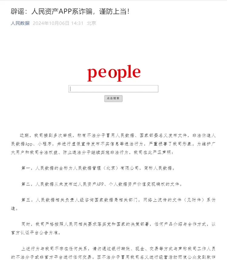 据网友反馈,该项目是“人民数据”改名而来,今天,人民数据管理(北京)有限公司发布声明《辟谣:人民资产APP系诈骗,谨防上当!》