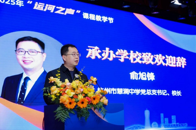 杭州市慧澜中学党总支书记、校长俞旭峰致欢迎辞,介绍了学校“情境启航·模型建构·成果创生”的课改实施框架与“跨界·融通·赋能”的校本路径。