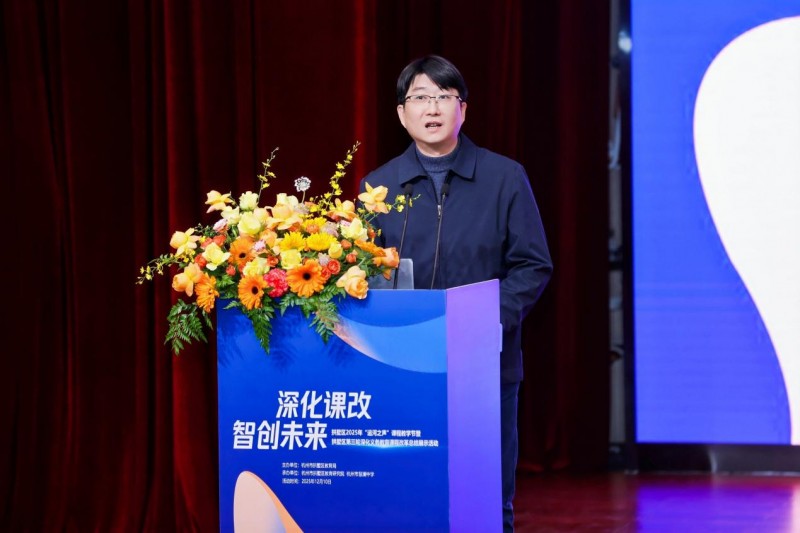 杭州市教育局党组成员、副局长蒋峰致辞。蒋局长表示,课程改革是培养时代新人的战略举措。拱墅区作为课改先行区,在学科实践、教学评一致等方面成果显著。他强调,要坚持以素养为导向、强化学科实践,推动AI赋能教育,实现教育规模化与个性化统一。