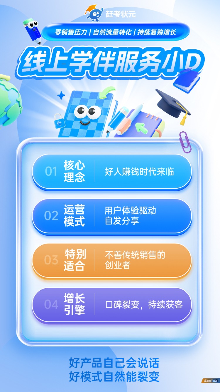 在教育行业回归理性、注重长效价值的今天,真正能持续发展的,必然是那些既能扎实提升学生综合素养,又拥有健康运营模型的事业。“赶考状元AI线上学伴”模式,通过“科技”与“育人”的深度融合,不仅为孩子们铺就了一条更高效、更快乐的成长路径,也为有志于在这一领域长期创造价值的教育人,提供了一条能够兼顾教育初心与商业可持续性的发展道路。这不仅仅是一门生意,更是一项关于塑造未来、需要匠心与智慧共同参与的长期事业。
