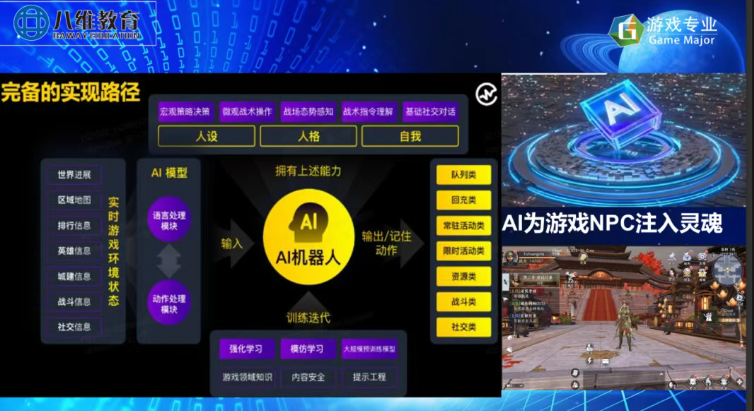核心方向一:深化“AI+游戏”研发实战。 课程体系重点强化人工智能技术在游戏开发全流程中的应用。学生不仅学习如何利用AI工具辅助原画概念生成、场景搭建和代码开发以提升效率,更深入探究AI在游戏逻辑中的应用,如智能NPC行为树设计、基于机器学习的动态难度调整以及玩家行为数据分析等。教学通过覆盖角色扮演、多人在线、策略等多种主流游戏类型的综合性研发项目展开,使学生能在真实的技术挑战中,掌握将AI能力转化为游戏产品竞争力的方法。